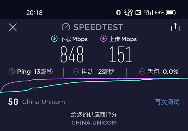 我們選用專業(yè)網(wǎng)速測試軟件,選用默認連接節(jié)點,測試5G網(wǎng)絡條件下realme真我Q3 Pro的傳輸速度。實測其在5G網(wǎng)絡(SA+NSA)下可以達到下行848Mbps,上行151Mbps,抖動2ms的水準。