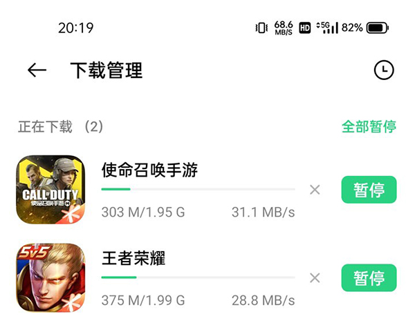 隨后,我們打開應用商店,測試在5G網(wǎng)絡下下載大型應用游戲的速度。5G網(wǎng)絡下,realme真我Q3 Pro峰值下載速度可達68.6MB/s,體現(xiàn)出了5G網(wǎng)絡在下載時的巨大優(yōu)勢。