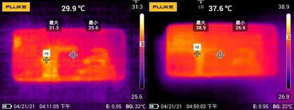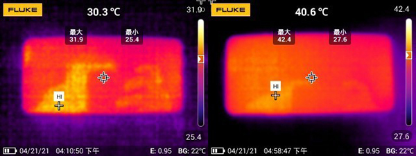 一加9R游戲前后正面溫度(左為前)