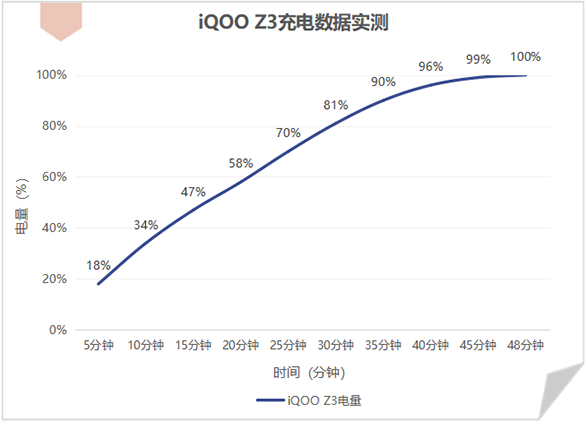 此外,iQOO Z3在快充方面帶來(lái)的是55W閃充技術(shù),據(jù)實(shí)測(cè)數(shù)據(jù)顯示,將手機(jī)電量充至100%耗時(shí)僅48分鐘,20分鐘充電則可獲得52%電量。而為了提升充電安全系數(shù),iQOO Z3則在機(jī)身中引入了十一重智能充電防護(hù)系統(tǒng),控制機(jī)身在高速充電過(guò)程中所出現(xiàn)的發(fā)熱情況,確保機(jī)身溫度處在安全界限內(nèi),讓充電過(guò)程保持高速、平穩(wěn)。