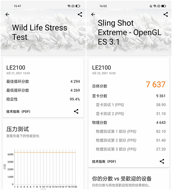 在偏向GPU性能的3D Mark軟件測(cè)試中,一加9R在壓力測(cè)試中表現(xiàn)較為不錯(cuò),最低分?jǐn)?shù)4269分,最高分?jǐn)?shù)4294分,20輪的壓力測(cè)試之后,性能前后變化的幅度并不大,穩(wěn)定性99.4%,相比驍龍888處理器要穩(wěn)定許多。而在3DMark基準(zhǔn)測(cè)試中,一加9R也獲得了7637分的不錯(cuò)成績(jī)。