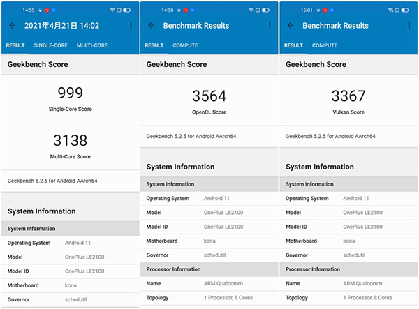 在Geekbench5軟件測(cè)試中,CPU的單核獲得999分,多核獲得3138分,而在GPU測(cè)試項(xiàng)目的OpenCL 獲得3564分,Vulkan獲得3367分,整體的性能跑分還算不錯(cuò),達(dá)到了驍龍870應(yīng)有的水準(zhǔn),相比驍龍888處理器單核與多核的性能都要更弱一些。