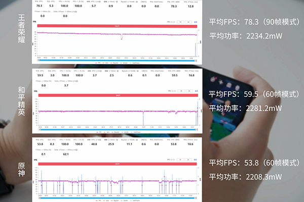 通過下圖,其實(shí)不難看出,一加9R在主流的幾款手游中均有不錯(cuò)的表現(xiàn),功耗控制的也較為不錯(cuò)?!锻跽邩s耀》能夠以90幀的模式運(yùn)行,游戲流暢感確實(shí)更強(qiáng),而即便是對(duì)配置高要求的《原神》游戲中,平緩的FPS數(shù)值走線已表明游戲的穩(wěn)定,平均FPS 53.8,長(zhǎng)時(shí)間運(yùn)行之后表現(xiàn)確實(shí)要優(yōu)于部分驍龍888手機(jī)。