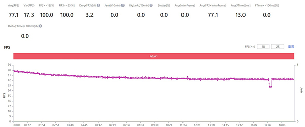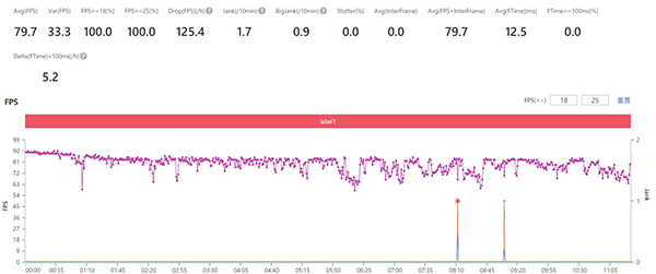 在《王者榮耀》超高分辨率、極致畫質(zhì)、90幀模式下,一加9R一局游戲下來平均幀數(shù)為77.1幀,沒有明顯的波動(dòng),不過有一個(gè)緩慢下降的過程,對(duì)比此前測(cè)過的870機(jī)型,一加9R的性能調(diào)度偏保守使得最終呈現(xiàn)的游戲幀數(shù)偏低。