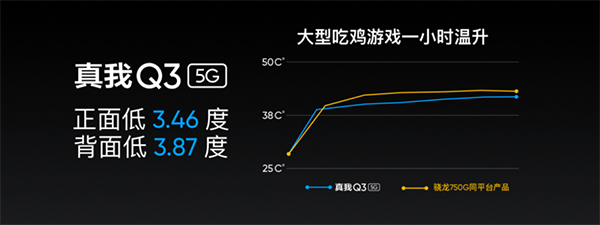 值得一提的是,真我Q3搭載了同級罕見的電競級VC液冷散熱,并覆蓋多層立體式石墨散熱,總散熱面積可達(dá)9969平方毫米,百分百全面覆蓋核心發(fā)熱源。官方實(shí)測吃雞一小時(shí),真我Q3的正反面溫度均比同平臺產(chǎn)品更低。