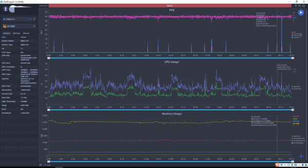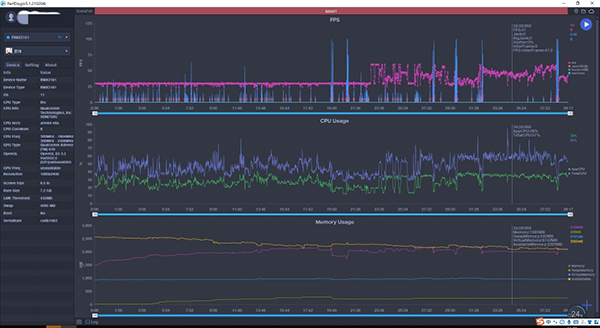 最后,實(shí)測公認(rèn)的吃性能大戶《原神》,在系統(tǒng)默認(rèn)的畫質(zhì)下,前20分鐘左右都在30幀的狀態(tài)下運(yùn)行,可以看到真我Q3在幀率上保持得還是比較穩(wěn)健的,但是卡頓次數(shù)較前面兩款游戲明顯上升,但整體還算流暢。后面幀率開始波動較大是由于將游戲幀率改成了60fps,觸發(fā)性能瓶頸。總結(jié),真我Q3可以高畫質(zhì)流暢運(yùn)行大部分主流游戲,像《原神》這種另類則需要維持在游戲默認(rèn)的畫面設(shè)置。