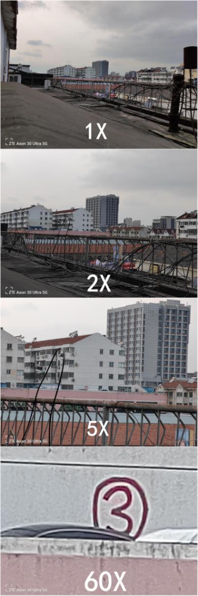 中興Axon30 Ultra的變焦能力也是十分強(qiáng)大,在不變焦的狀態(tài)下拍攝的照片中,是看不到遠(yuǎn)處樓房墻上的數(shù)字的,進(jìn)行5倍變焦之后可以勉強(qiáng)看到墻上的數(shù)字,但是依然很小。在進(jìn)行60倍變焦之后,可以很清楚的看到大約500米之外建筑物墻壁上的數(shù)字,而且就連汽車身上的鍍鉻裝飾條都可以很清楚的辨別出來(lái)。