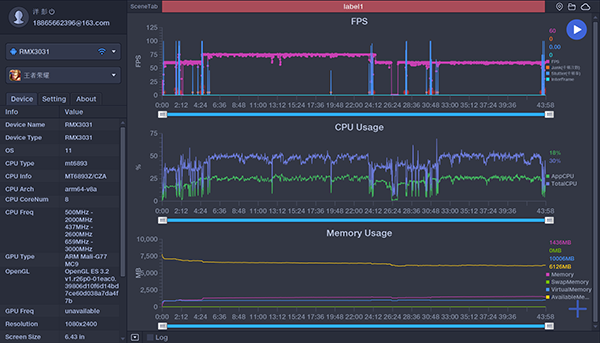 CPU和APP的使用率,整體比較平穩(wěn);而內(nèi)存占用率,隨著幀率的變化,有降低的趨勢(shì)。