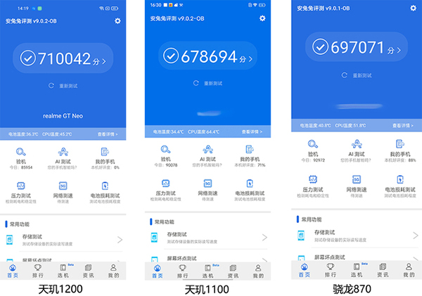 從制程工藝到架構設計以及功能特性來看,天璣1200本身的性能和對于手機整體體驗的提升還是非常出色的。實際的跑分也證明了這個事實,最新的安兔兔V9版本跑分達到71萬+,比天璣1100高出了4萬分左右,比驍龍870也高出了2萬分左右。