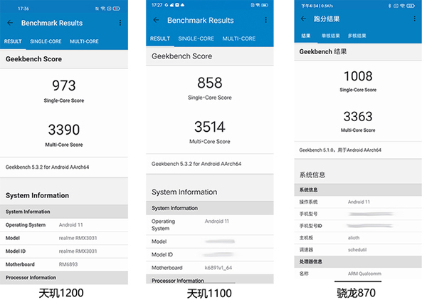 此外,其單核成績973分,多核成績3390分;對比天璣1100單核成績858分,多核3514分;驍龍870單核1008分,多核3363分??梢钥闯?,天璣1200的單核成績領先天璣1100,基本與驍龍870持平,多核成績稍遜天璣1100,同樣與驍龍870持平。