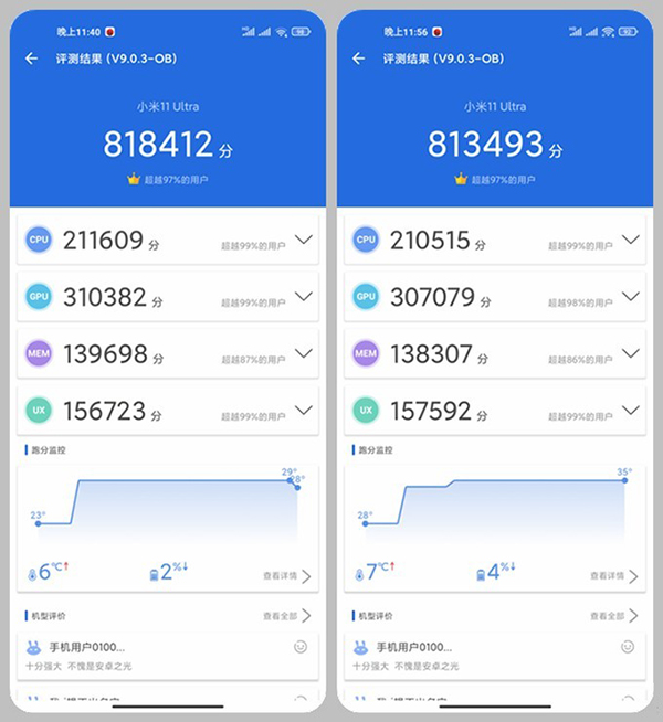 安兔兔V9版本連續(xù)跑分,室溫情況下最高81.8萬分,最低81.3萬分,平均81.5萬分,平均溫升7攝氏度左右,我也在安裝冰封散熱背夾的情況下測試過跑分,溫升控制在3攝氏度左右,但是性能差距不大,所以可以看出小米11 Ultra散熱還是比較穩(wěn)的,溫度對于性能影響因素不敏感,但另一個角度可以看出小米11 Ultra的性能調(diào)教也沒有太激進。