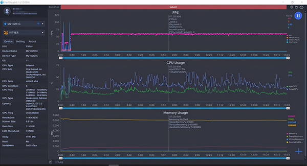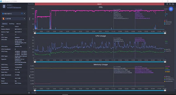 波動較大處為呼出鍵盤導致,實際游戲過程中幀率最高91幀,最低87幀,幀率波動4幀。整體流暢度還是非常不錯的,只是在90幀模式下機身發(fā)熱和功耗都稍微有一點點高,調(diào)為60幀溫度控制更好,并且電池也更加耐用。這就要看個人的取舍了。
