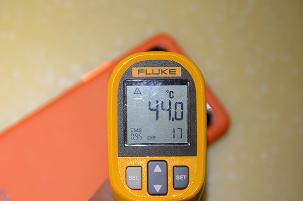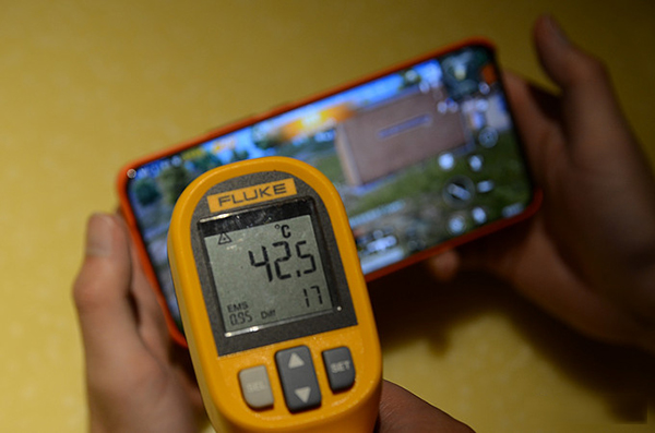 在連續(xù)1個半小時的游戲中,機身正面偏上(聽筒方向)的位置附近出現(xiàn)最高溫,大約42.5攝氏度。