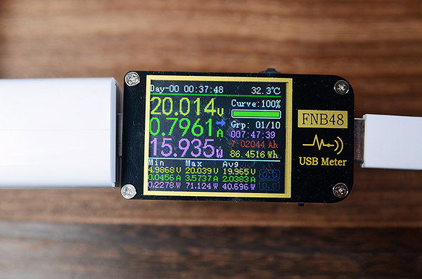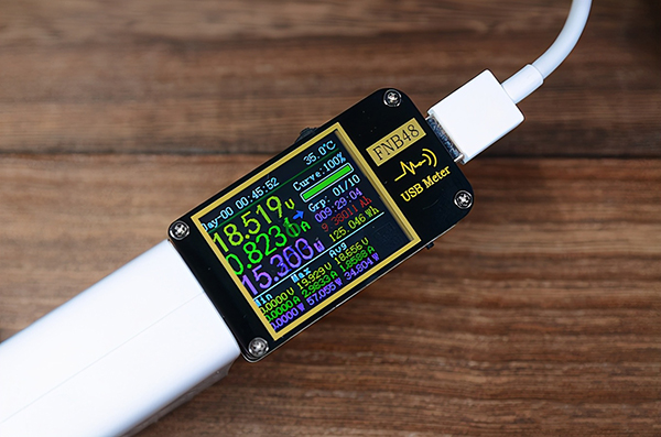 屏幕顯示充滿耗時44分鐘,后續(xù)涓流充電5分鐘,完全充滿耗時49分鐘。電源適配器端最大功率為57W。