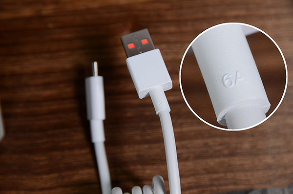 67W,其實(shí)就是11V 6.1A Max,比66W 11V 6A最大電流高了一點(diǎn)點(diǎn),所以搭配的魔改USB-A to C數(shù)據(jù)線也是最大6A的版本,這與120W充電器上配套那一根是一致的。