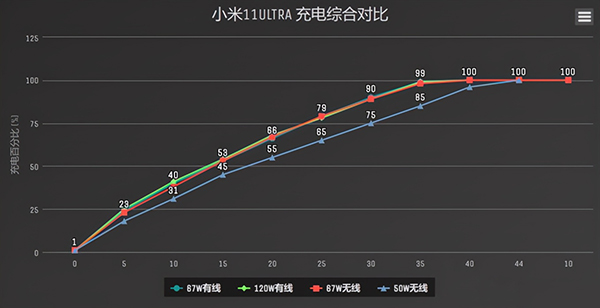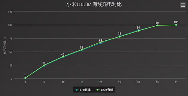 將120W充電曲線與67W比較,我們發(fā)現(xiàn)120W前期輸出穩(wěn)定,但后期67W充電器反超,最終比120W快大約一分鐘充滿,這樣來看67W比66W多的0.1A電流確實(shí)有實(shí)際意義,可能在某些極限情況下小米11 Ultra可以觸發(fā)11V電壓擋位來到67W最大功率。
