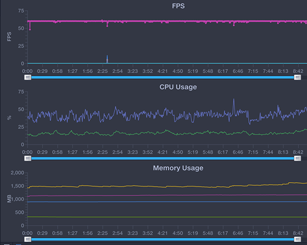首先來看王者榮耀,將幀率調(diào)至高幀率模式,目前Q3支持的王者榮耀是60Hz模式,可以看到幀率基本可以達到滿幀狀態(tài),比較的穩(wěn)定,而且CPU和內(nèi)存的使用負擔(dān)也不大,可以非常流暢的玩游戲了。