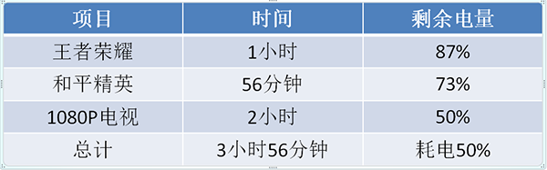 第一個(gè)測(cè)試的是玩游戲,玩了一個(gè)小時(shí)的《王者榮耀》,電量從100%掉至87%;然后再玩了54分鐘的《和平精英》,電量掉至73%;然而再看了2小時(shí)的1080P電視劇,電量掉至50%。