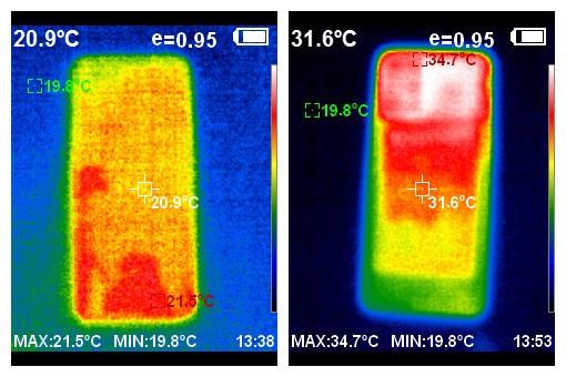 室溫在我們的實測中,室溫20℃的情況下,15分鐘的《王者榮耀》讓它的表面溫度最高值從21.5℃上升到了34.7℃。根據(jù)右側(cè)熱成像儀呈現(xiàn)的圖像我們可以看到,真我Q3的核心發(fā)熱區(qū)域為手機上半部分,不過由于最高溫度也沒有體溫高,所以手感上并沒有什么變化,所以實際上散熱問題是不用去擔心的。