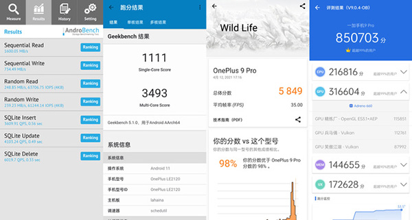 CPU方面Geekbench 5單核得分1111,多核3493;GPU圖形能力3DMark WildLife得分5849;內(nèi)存讀寫部分AndroBench順序讀寫分別為1600.05、734.49 MB/s,隨機讀寫分別為248.85、239.23 MB/s。綜合性的安兔兔V9.0.4-OB總分超85W(高性能模式),整體表現(xiàn)強勁。
