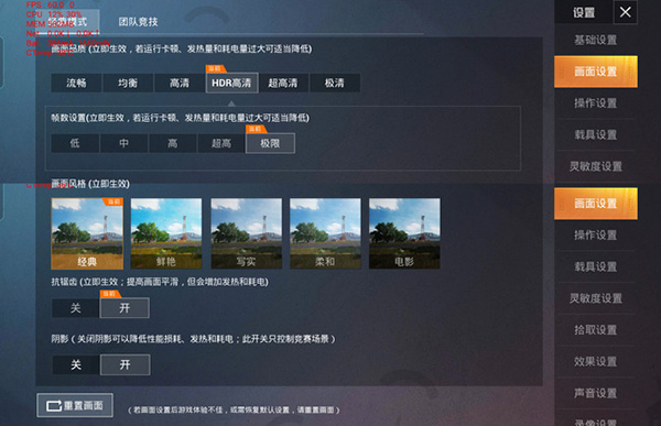 《和平精英》因為目前還沒有對一加9 Pro開放90幀模式,所以我們開啟「HDR高清+極限幀率+抗鋸齒開+陰影開」畫質(zhì)。