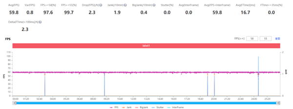 一加9 Pro在單局游戲中的幀率保持穩(wěn)定,60FPS波動很小,平均幀率達到了59.8FPS,≥58FPS的時間占比97.6%,99.7%的時間幀率≥55FPS,但出現(xiàn)了一處相對明顯卡頓,30分鐘掉電11%,表現(xiàn)不錯。