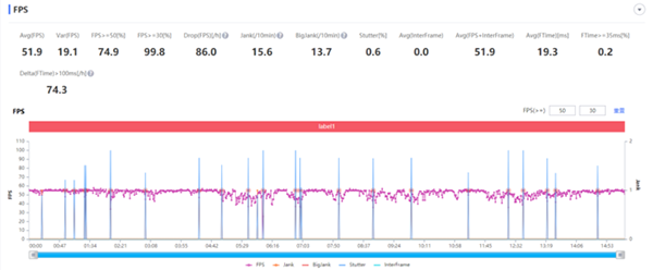 游戲幀率記錄如圖,兩圈下來一加9 Pro平均幀率51.9FPS,屬于驍龍888常規(guī)表現(xiàn),其中30FPS以上時間占比達到了99.8%,基本可以保持流暢,當然如果想要體驗更暢快的同學,其他視效可以相應減檔。