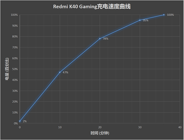 經(jīng)過筆者實測,Redmi K40游戲版從手機電量剩余2%開始充電,總共36分鐘的時間可以把5065mAh的電量完全充滿,前10分鐘的時候充至47%,接近一半兒了,20分鐘即可充至78%,整體速度非常快,而且最關(guān)鍵的是在充電的過程中,手機的后殼都是感受不到熱量的增加的,這也是這款手機在散熱方面做的比較優(yōu)秀的一個表現(xiàn)。