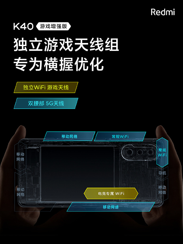 Redmi K40游戲增強(qiáng)版還采用了全新的無(wú)遮擋3Wi-Fi天線,即在手機(jī)頂部、中部和邊框部分分別內(nèi)置了一組Wi-Fi天線,無(wú)論是豎屏使用還是橫屏握持,都能夠保證至少有兩組天線處于無(wú)遮擋的狀態(tài),大幅提升了信號(hào)的穩(wěn)定性。