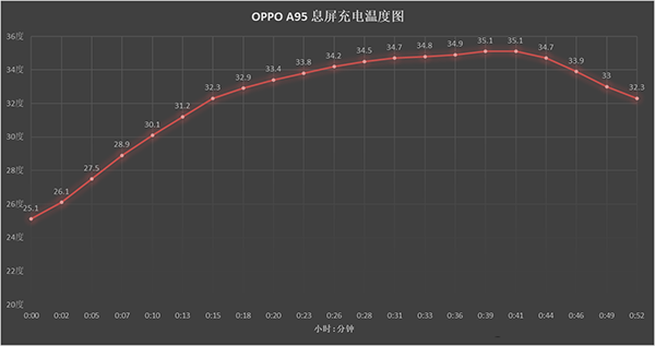 充電溫度方面,OPPO A95息屏峰值充電溫度35.1攝氏度,結(jié)束充電時溫度為32.3攝氏度,由此可以看出OPPO A95的充電溫控能力相當(dāng)優(yōu)秀,全程最高不到36度,觸感只是有一點溫?zé)岫选?