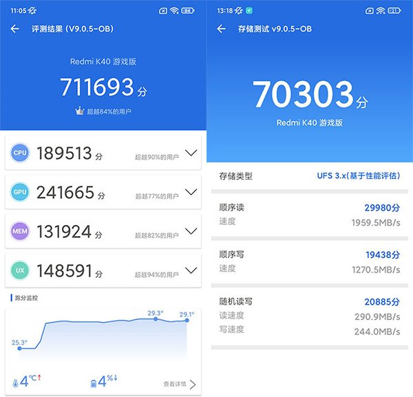 在安兔兔評測的基準(zhǔn)測試中,Redmi K40游戲增強(qiáng)版得分超過71萬分,存儲得分超過7萬分,通常環(huán)境下的性能表現(xiàn)不錯。如果按照分?jǐn)?shù)來進(jìn)行比較的話,該機(jī)正如我們之前所說,性能表現(xiàn)與驍龍870大致是一個水準(zhǔn),標(biāo)準(zhǔn)版的旗艦性能是妥妥的。