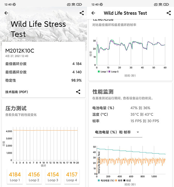 Redmi K40游戲增強(qiáng)版內(nèi)置了立體散熱系統(tǒng),多重石墨與超大VC均熱板覆蓋手機(jī)所有主要熱源。航天級的散熱材料不僅導(dǎo)熱性能強(qiáng),還有著良好的絕緣性,大面積覆蓋不影響天線性能。在3DMark的穩(wěn)定性測試中,該機(jī)取得了98.9%的穩(wěn)定表現(xiàn),意味著其幾乎不會讓處理器溫度過高,避免了發(fā)熱問題導(dǎo)致的降頻、性能下降。