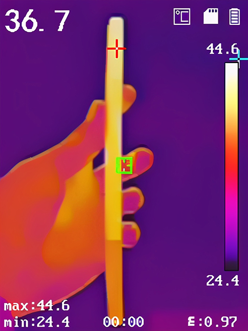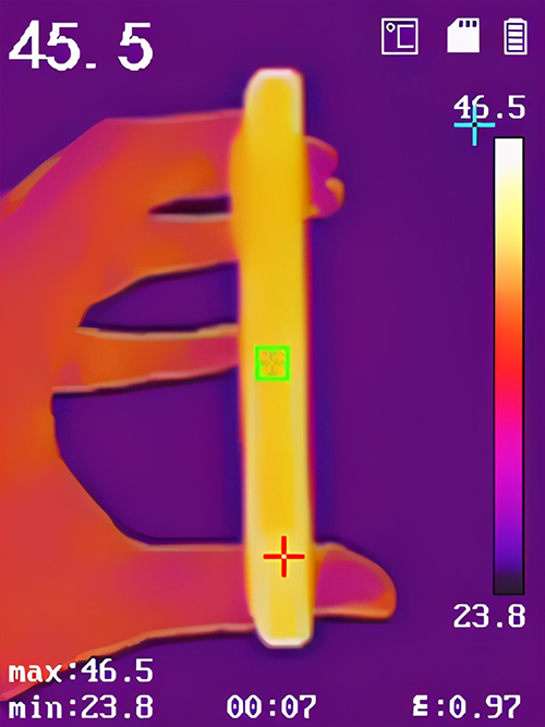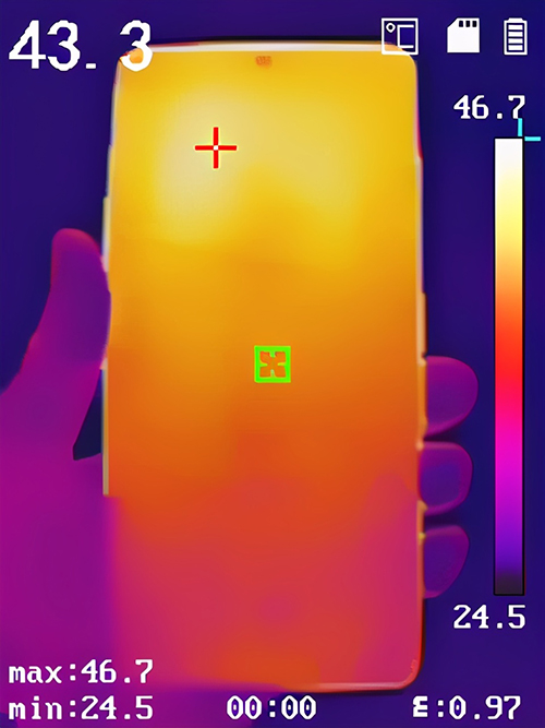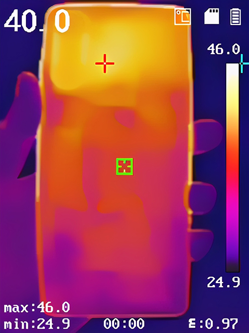 通過(guò)熱成像儀來(lái)了解Redmi K40游戲增強(qiáng)版在的溫度表現(xiàn),分別是正面、側(cè)面(左右)、背部以及頂部中框,機(jī)身正面最高溫度達(dá)到了46.7℃、中框左右兩側(cè)最高溫度分別是46℃、45.2℃,手機(jī)背面的最高溫度達(dá)到了46℃,頂部中框最高溫度達(dá)到了46.5℃,帶來(lái)的手感溫度還是相對(duì)較高的。