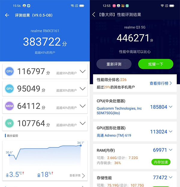 在手機(jī)的性能方面,realme真我Q3搭載了高通驍龍+LPDDR4X+UFS2.1的組合。其中高通驍龍750G采用8nm制程工藝,有著兩顆主頻2.2GHz的Cortex-A77大核,與上代旗艦芯片驍龍865規(guī)格一致,Adreno 619 和第五代AIE構(gòu)架NPU同樣采用驍龍865同代技術(shù)。全面看齊旗艦芯片的規(guī)格,搭配同級(jí)首個(gè)電競級(jí)VC液冷散熱系統(tǒng),性能表現(xiàn)的自然值得期待。