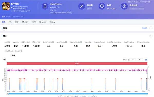 一盤游戲下來接近28分子,真我Q3測(cè)得的平均幀率為29.9fps,從幀率曲線中也可以看出曲線穩(wěn)如老狗一般,即使在游戲中進(jìn)行了長時(shí)間的載具駕駛,真我Q3也沒有因?yàn)椤俺圆幌倍D。