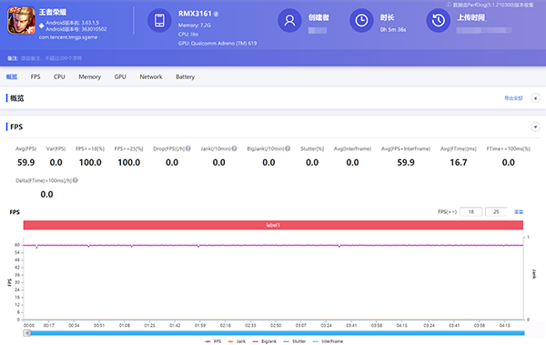 在3V3這種超短時(shí)間人機(jī)中,特別是幀率上限為60fps后,即使是多盤的游戲中,曲線并沒有出現(xiàn)波動(dòng),59.9fps的成績,穩(wěn),那是真的穩(wěn)。