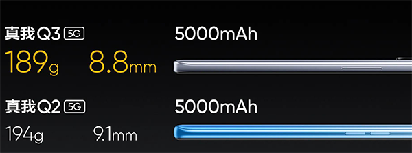 拋開realme真我Q3的高顏值不說,畢竟審美這方面因人而異,沒有絕對意義上的“更好看”。但從機身重量的控制上來說,realme真我Q3的整機重量只有189g,而另外兩款機型重量分別為199g和191g,依然不如realme真我Q3控制得出色。