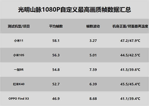 《光明山脈》中,一加9R的幀數(shù)雖然比小米10S差點(diǎn),但在次旗艦機(jī)型中,平均幀數(shù)表現(xiàn)已經(jīng)很不錯(cuò)了,而且相較于圖表中的小米三兄弟發(fā)熱還比較低。和OPPO Find X3相比,一加9R發(fā)熱和OPPO Find X3差不多,平均幀率要高不少。