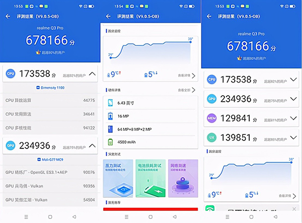 成為戰(zhàn)斗機首要前提還得性能夠強悍,realme真我Q3 Pro搭載了天璣1100處理器,同時還配備了UFS 3.1高速閃存,安兔兔得分679397雖說不是頂級的配置但在千元機里面也是有一席之位,運行市場上一些大型游戲還是綽綽有余的。