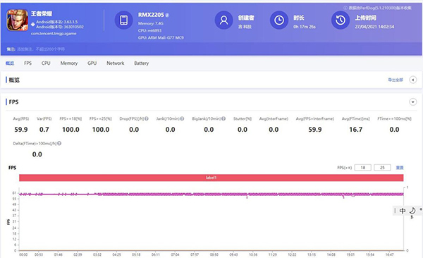 以下是我的游戲幀率圖,測試了20分鐘,總體幀率都能夠穩(wěn)定維持在60幀左右,正常游戲過程中也沒有出現(xiàn)任何的卡頓現(xiàn)象,不然任何細節(jié)怎么可能瞞得過幀率檢測。其實就沖這一點,也讓我對千元機大有改觀,再也不是大學時候的千元機了。如果要說詳細點,有這幾方面比較滿意,之前說的流暢也算其中一個了。