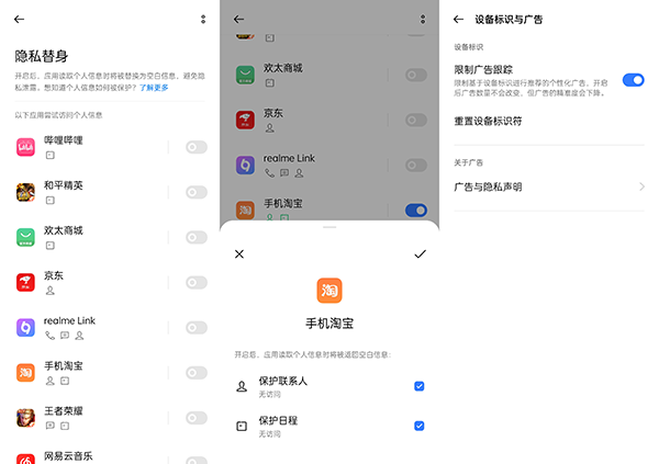 隨著國(guó)內(nèi)對(duì)于APP搜集用戶信息的重視,realme UI 2.0系統(tǒng)在隱私保護(hù)方面也做了相關(guān)設(shè)置,比如「隱私替身」,設(shè)置之后,APP讀取用戶信息時(shí)會(huì)提供一個(gè)空白信息,一定程度上保護(hù)了用戶的信息安全,當(dāng)然有些APP設(shè)置之后可能會(huì)出現(xiàn)閃退不能正常運(yùn)行,使用時(shí)注意看一下。還有「限制廣告跟蹤」,可以相對(duì)的減少大數(shù)據(jù)跟蹤。