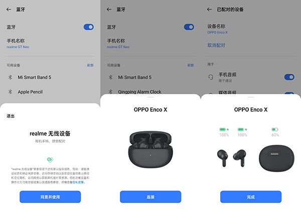 另外,realme UI 2.0系統(tǒng)也支持OPPO ENCO X 真無線耳機(jī)的彈窗顯示,第一次設(shè)置時(shí),一打開耳機(jī),GT Neo就馬上搜到了耳機(jī),這也是為什么我一直推薦真無線耳機(jī)盡量購(gòu)買同手機(jī)品牌的,整體的連貫體驗(yàn)非常不錯(cuò),但是遺憾的是真我GT Neo只支持AAC編碼傳輸。