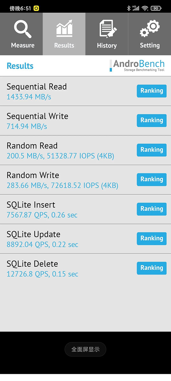 看完這個,再來看看AndroBench的ram和rom測試結果。ufs3.1和LPDDR5的效果都是不錯的,該機都是現(xiàn)在最新的ram和rom,表現(xiàn)都比其他的要好一些。這通俗一些就是:下載一個1G的軟件,安裝只要十幾二十秒左右,另一個是內(nèi)存速度快打開應用就快一點。