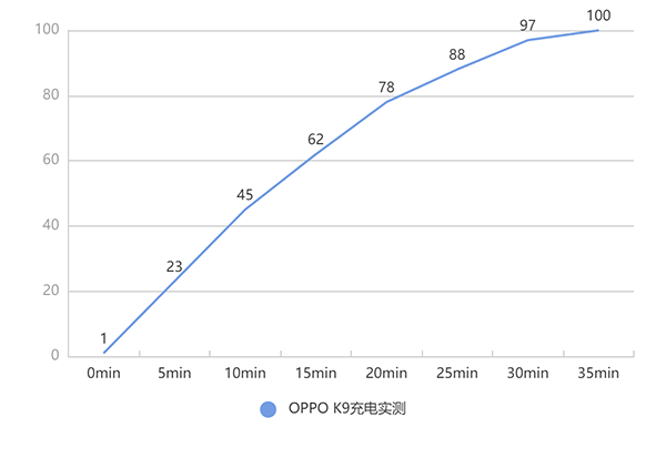 并且OPPO K9還支持65W超級(jí)閃充和邊充邊玩,實(shí)測34分鐘就能把手機(jī)電量充到100%。大家從上圖充電實(shí)測表可以看到,OPPO K9在前20分鐘充電速度非???,到了后半段的涓流充電速度也很快,并不會(huì)像其他品牌那樣涓流充電拉長了整個(gè)充電時(shí)長。游戲中電量告急,吃個(gè)飯的時(shí)間K9又能充滿了,這點(diǎn)確實(shí)值得好評(píng)。