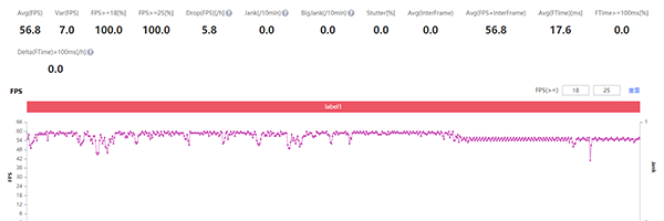 OPPO K9同樣在《和平精英》在游戲中開啟超高幀率、畫質(zhì)設(shè)為均衡。從上圖可以看出OPPO K9的平均幀率為56.8。整局游戲下來(lái)幀率也比較穩(wěn)定,只不過(guò)在開始跳飛機(jī)時(shí),幀率會(huì)產(chǎn)生一些波動(dòng),但對(duì)于游戲中開鏡、走位的影響就微乎其微了,基本上整局游戲還是比較流暢的。