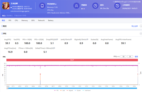 《王者榮耀》意外地沒有出現(xiàn)太多的幀數(shù)波動,即便是在團戰(zhàn)期間也能保持幀數(shù)穩(wěn)定,這點是比較令人費解的,尤其是游戲本身開啟的最高畫質(zhì)和60fps幀數(shù)上限,不免令人懷疑這真是一款驍龍768G的手機?但測試結(jié)果卻令我們不得不信。