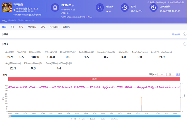 還是先來看測試效果。《和平精英》能開啟HDR高清畫質(zhì)、超高幀數(shù),也就是最高40fps上限。如果按照得分對比,驍龍888的機型在相同畫質(zhì)、60fps上限的情況下,應(yīng)該會更穩(wěn)定。但實際上,K9在整個游戲過程中只出現(xiàn)了一次卡頓(結(jié)束時一次是結(jié)算畫面卡頓,正常情況),幀數(shù)方差0.5,穩(wěn)定性要比測試過的驍龍888機型好上不少。