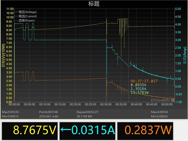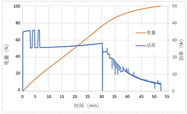 實(shí)測(cè)快充速度上,最高功率約35W,持續(xù)時(shí)間約6min,之后降到25W左右,一直持續(xù)到30min,充電至90%,UI 滿電 時(shí)間為40min,之后進(jìn)入涓流充電時(shí)段,完全充滿約52min,這個(gè)成績(jī)?cè)趩坞娦?0W以上快充方案里屬于主流水平,和行業(yè)內(nèi)60W以上雙電芯方案還有一定差距。