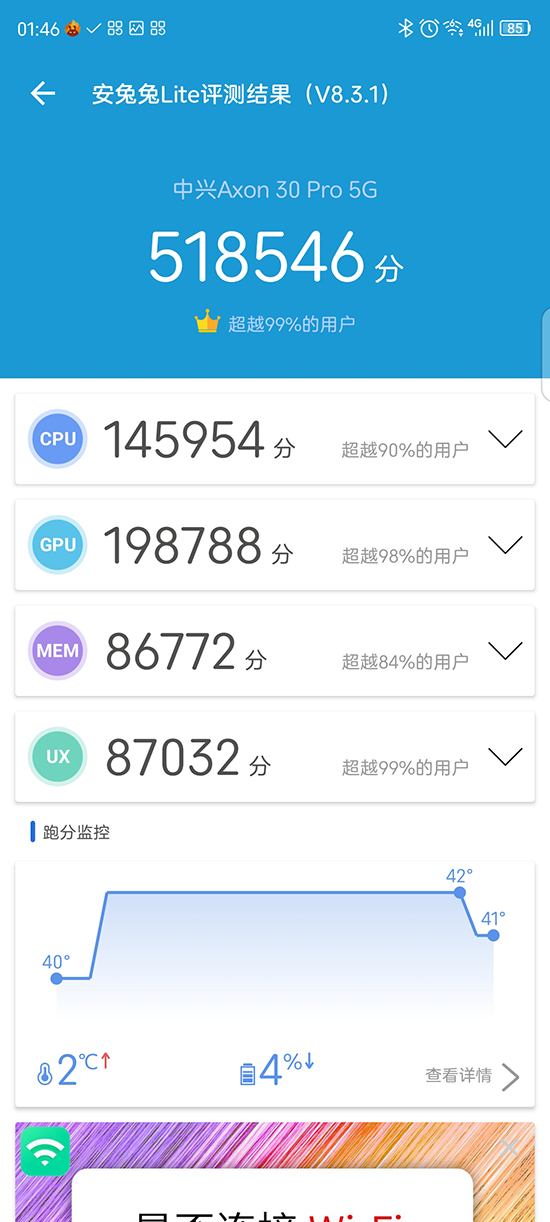 最終只有安兔兔Lite(V8.3.1)可以完成測試,分數(shù)為518546分。但我可以確定,Axon30 Pro日常使用不會受任何影響,在正常游戲中不會因內(nèi)存不足而閃退,《王者榮耀》《和平精英》《QQ飛車》都能最高畫質(zhì)流暢運行,機身發(fā)熱也在可以接受的范圍內(nèi)。