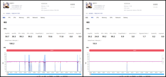 而在游戲測試中,iQOO Neo5的表現(xiàn)也確實沒讓大家失望。從幀率曲線中我們可以看到,獨(dú)立顯示芯片對于游戲畫面的體驗確實有一定的加成,開啟插幀之后幀率穩(wěn)定性得到了明顯的改善(幀率測試軟件測試所得幀率數(shù)據(jù)為原生設(shè)置的幀率,并非是實際顯示幀率)。
